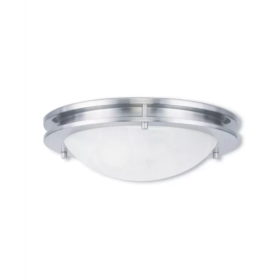 A strong, Art Deco-influenced ceiling light fixture. Features graceful bands of brushed nickel encircling a white alabaster glass. A great lighting look for the kitchen, hallway, bathroom and more.