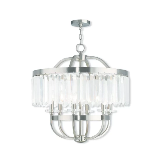 The Ashton six light chandelier emanates the 1920s casual style mixed beautifully with high sophistication. Classical touches in the chandelier gives off an art deco feel with the prismatic crystals.