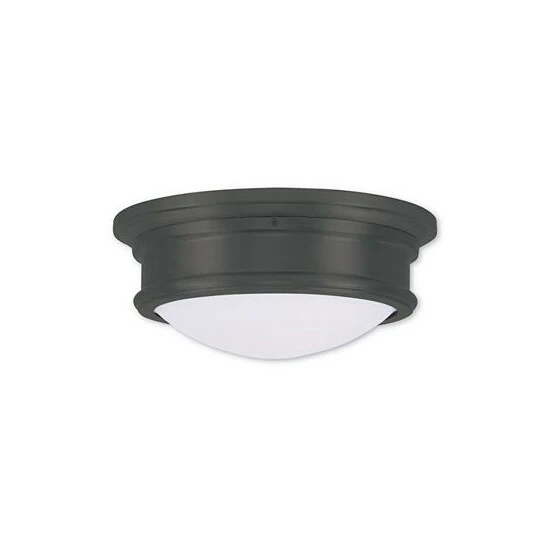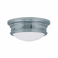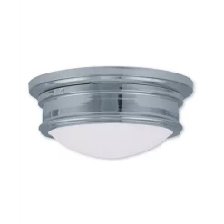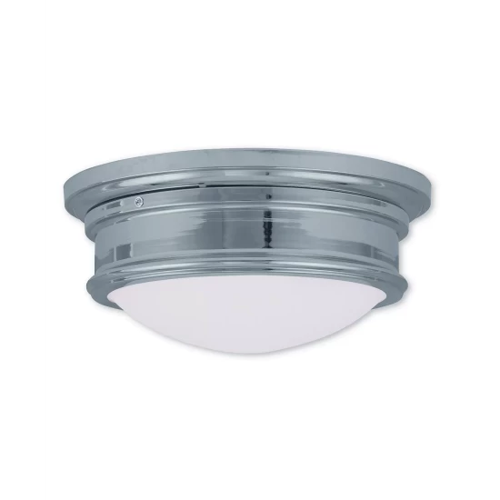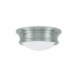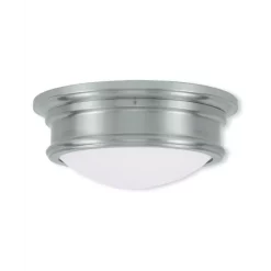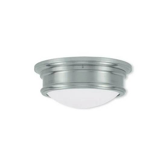 In a brushed nickel finish paired with hand blown satin opal white glass, this sleek flush mount will complement your transitional decor with its clean, stylish look.