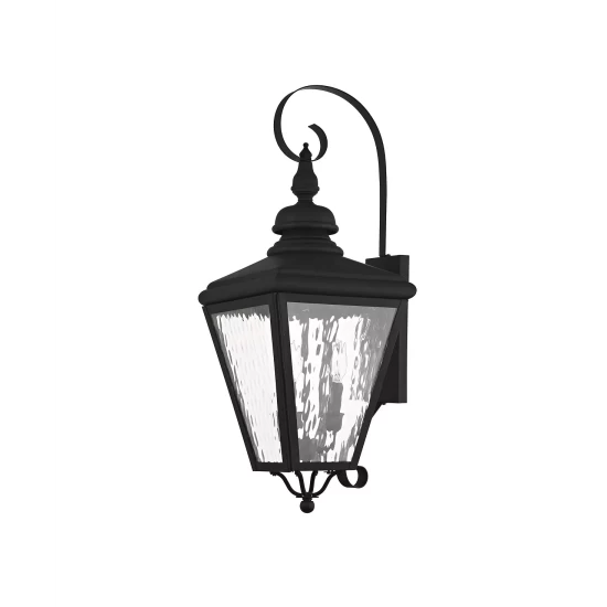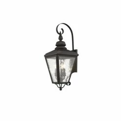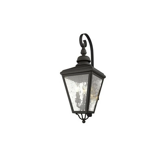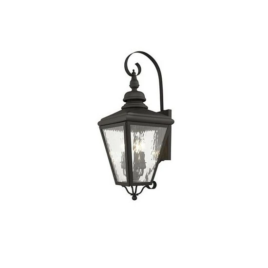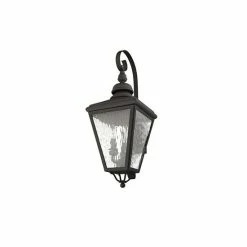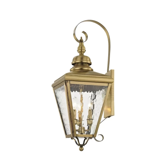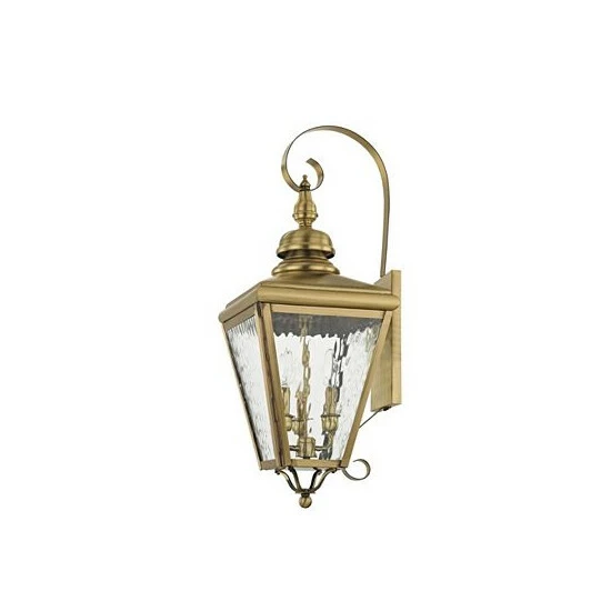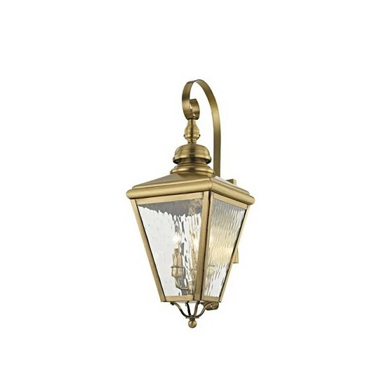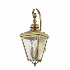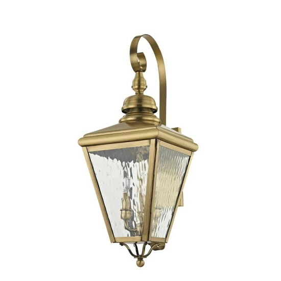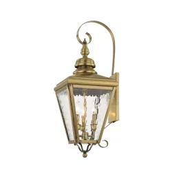 This stylish outdoor wall lantern is a great way to update your home’s exterior decor. A flat metal curved arm attaches the solid brass decorative housing to the square backplate while clear water glass protects the three bulbs.