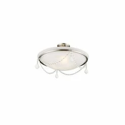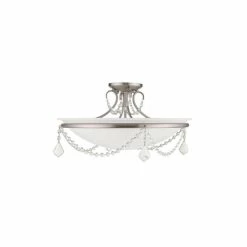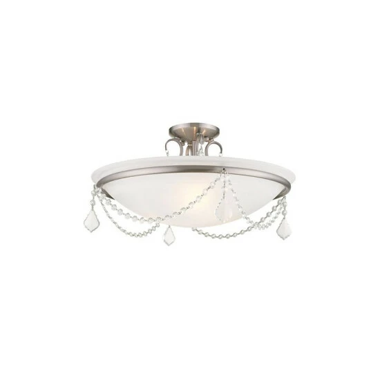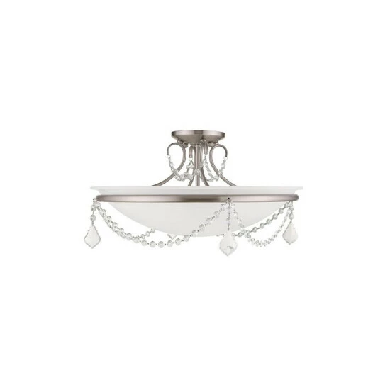This intricately accented and masterfully forged three light semi flush mount is from the Pennington collection. Finish is a brushed nickel and features include gracefully sculpted arms, sparkling clear crystal and white alabaster glass.