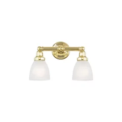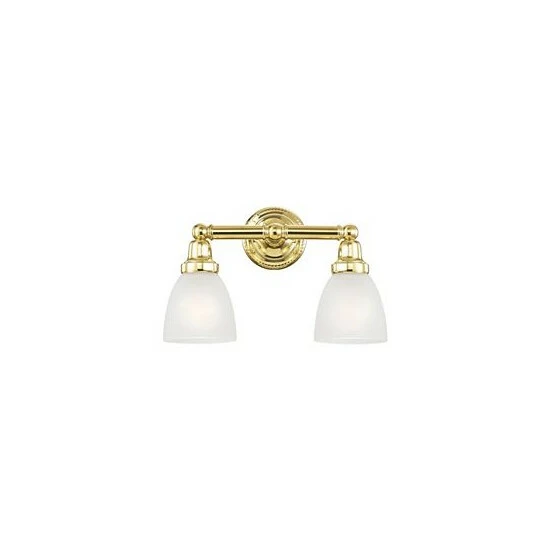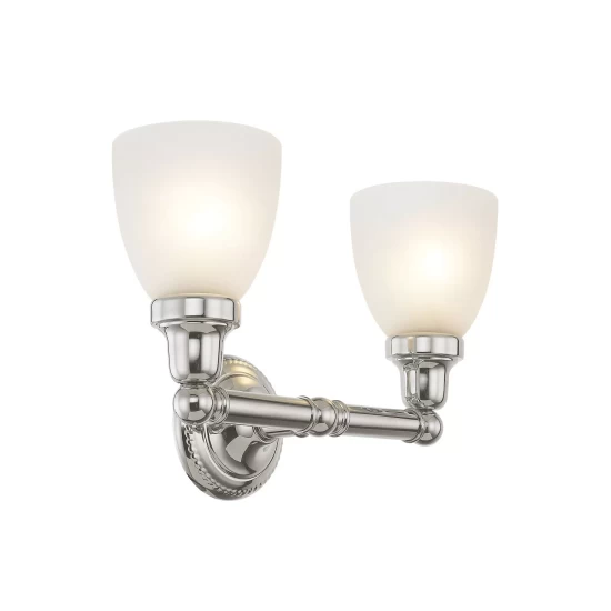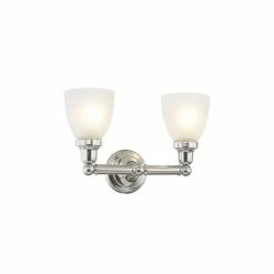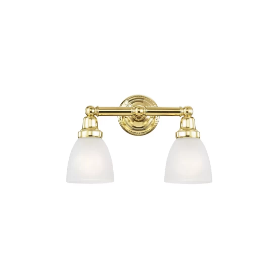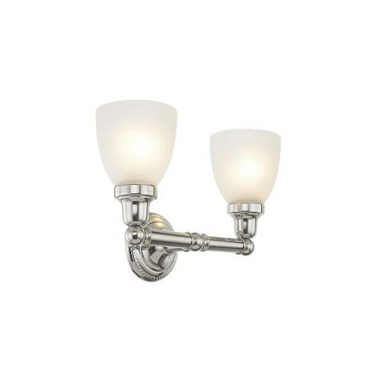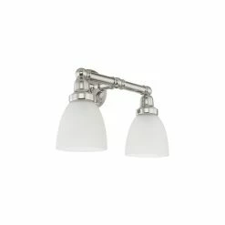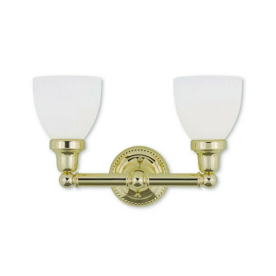 In a beautiful finish, this two light bath fixture features a timeless torchiere design. Topped with Satin Opal White glass shades which provide a clean and classic look. This fixture is the perfect finishing touch to your bathroom.