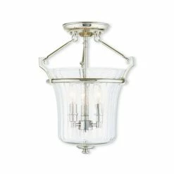 This sophisticated semi flush mount is perfect for your traditional or transitional style home decor. A decorative had crafted fluted clear glass is suspended from a brushed nickel canopy by three rod attachments.