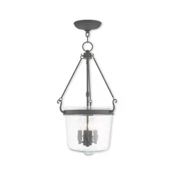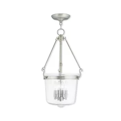 A hand crafted seeded glass holds four candelabra bulbs in this wonderful chain hung bell jar lantern.