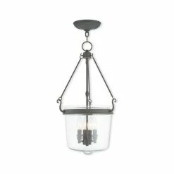 A hand crafted seeded glass holds four candelabra bulbs in this wonderful chain hung bell jar lantern.