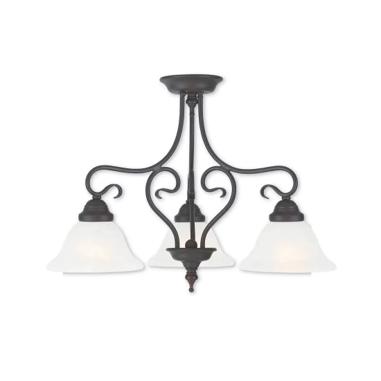 Classic bronze three light chandelier paired with white alabaster glass. Timeless in its vintage appeal, this light is stylish for both new and restored homes.