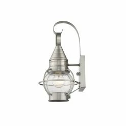 The Newburyport outdoor wall lantern boasts classic nautical and railway styling with a beautiful hand blown clear glass globe and a finish over the solid brass construction.