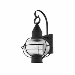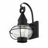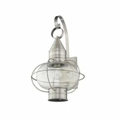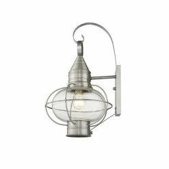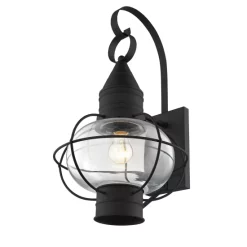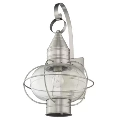 The Newburyport outdoor wall lantern boasts classic nautical and railway styling with a beautiful hand blown clear glass globe and a finish over the solid brass construction.