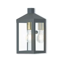 The dramatically simple shape and bold lines help define our Nyack wall lantern. This outdoor wall lantern has panels of clear glass.