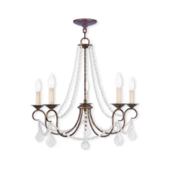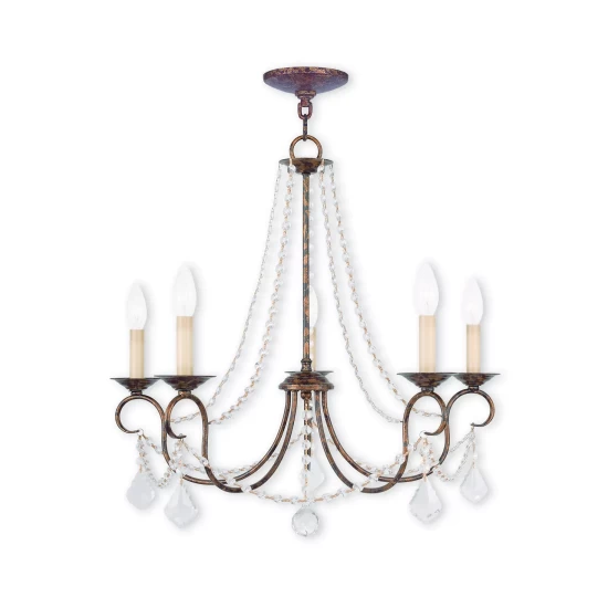 This intricately accented and masterfully forged five light chandelier is from the Pennington collection. Finish is a antique silver leaf and features include gracefully sculpted arms and with sparkling clear crystal.