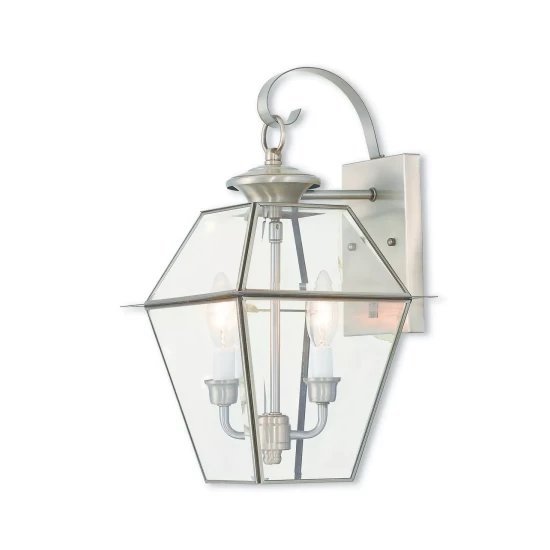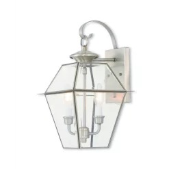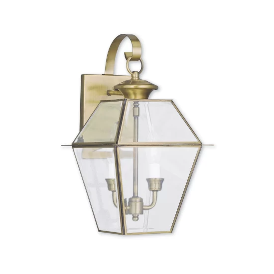 Inspired by the historic look and romantic feel of gas-burning lamps, our Westover collection is reminiscent of antique gas lights. This solid brass piece features two light behind large panes of clear beveled glass.