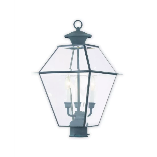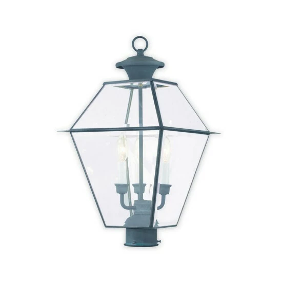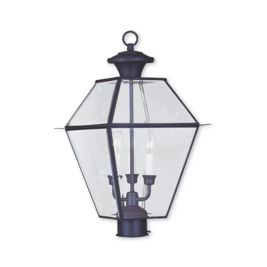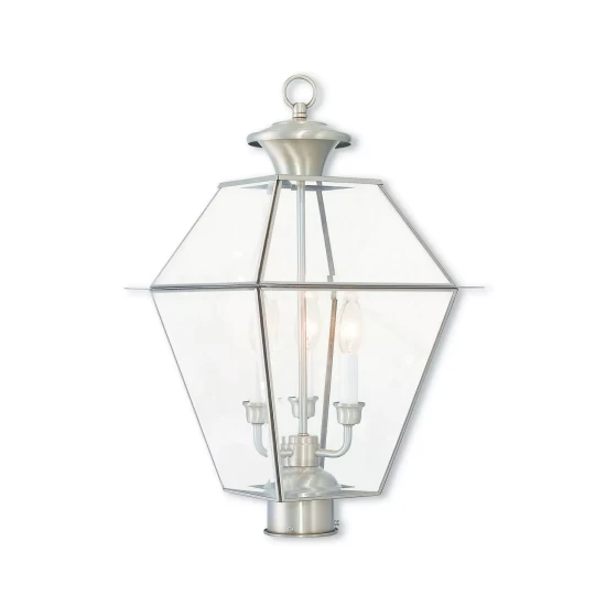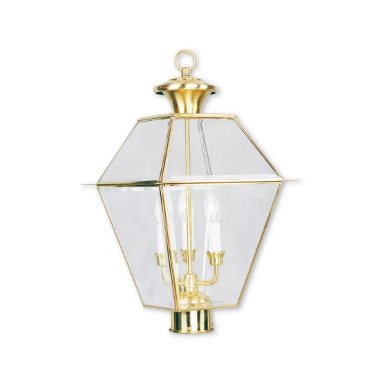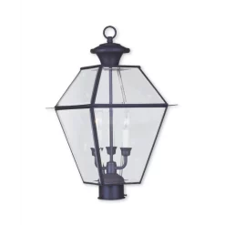 Inspired by the historic look and romantic feel of gas-burning lamps, the Westover collection is reminiscent of antique gas lights. This solid brass piece features three lights behind large panes of clear beveled glass.